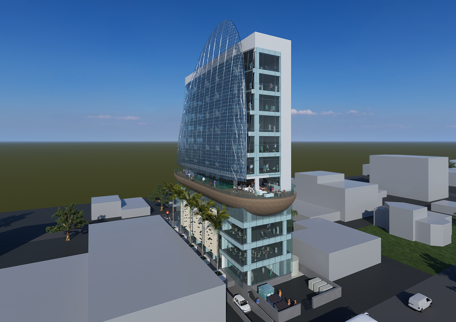 FASANOC occupies the first 4 floors. Level 4 features a Sky Terrace boasting breathtaking views toward Suva and the Pacific Ocean. The Sky Terrace is a convenient meeting point for FASANOC staff, the commercial tenants, and the local businesses community. It is a multi-functional space featuring a café, restaurant, bar, an outdoor 25m lap pool, and training spaces for elite athletes. The Sky Terrace also provides evening dining and function space for hosting dignitaries, or other special events.